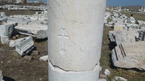 Another ancient city close to Hierapolis with a significant Jewich community is Laodicea, the important Christian centre. Cicero states that 20 talents of Jewish gold sent from Laodicea to the Temple of Jerusalem were confiscated by L. Valerius Flaccus in Laodicea in 61–60 BC. While walking in Laodicea, you can see many interesting details; one of them is a column with a menorah, cross and a shofar chiseled on it.